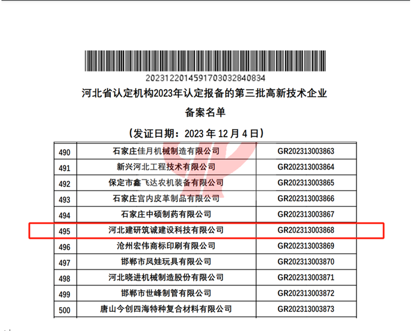 20231220日,全國(guó)高新技術(shù)企業(yè)認(rèn)定管理工作領(lǐng)導(dǎo)小組辦公室公示了河北省認(rèn)定機(jī)構(gòu)2023年認(rèn)定報(bào)備的第三批高新技術(shù)企業(yè)備案名單,河北建研筑誠建設(shè)科技有限公司順利通過了國(guó)家高新技術(shù)企業(yè)認(rèn)定(證書編號(hào)GR202313003868),標(biāo)志著公司在科技創(chuàng)新的道路上又邁出了堅(jiān)實(shí)的一步。
